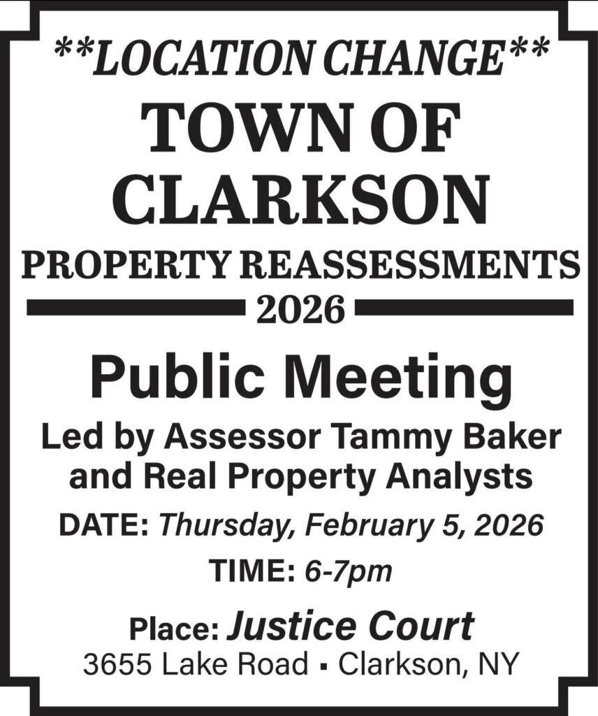 The location of the upcoming Town of Clarkson 2026 Property Reassessment Public Meeting has changed. The meeting, led by Assessor Tammy Baker and Real Property Analysts, will take place on Thursday, February 5, 2026 from 6:00 to 7:00 PM at the Justice Court, 3655 Lake Road, Clarkson, NY.